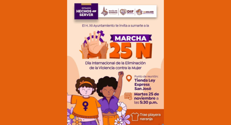 El H. XII Ayuntamiento de Bahía de Banderas reitera la invitación a la ciudadanía, para que este martes 25 de noviembre se sume a la Marcha 25N, en conmemoración del Día Internacional de la Eliminación de la Violencia contra la Mujer.