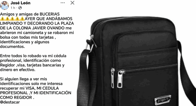 De acuerdo con su denuncia pública, mientras limpiaba y decoraba la plaza de la colonia Javier Ovando, sujetos desconocidos abrieron su camioneta y se llevaron una bolsa con documentos personales, tarjetas bancarias, identificación como regidor, su cédula profesional y dinero en efectivo.