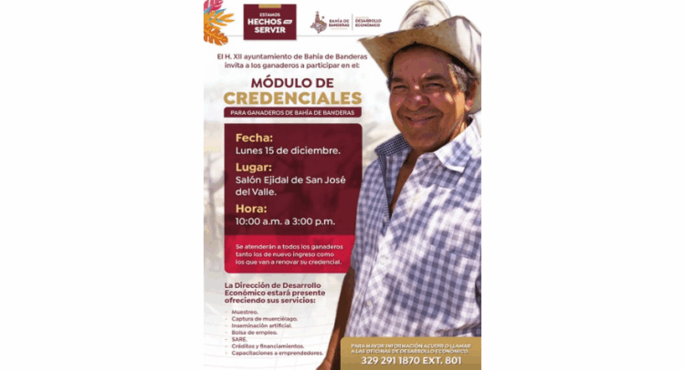El H. XII Ayuntamiento de Bahía de Banderas anuncia la instalación del Módulo de Credenciales para Ganaderos, que se realizará el lunes 15 de diciembre en el Salón Ejidal de San José del Valle, con un horario de atención de 10:00 a 15:00 horas.