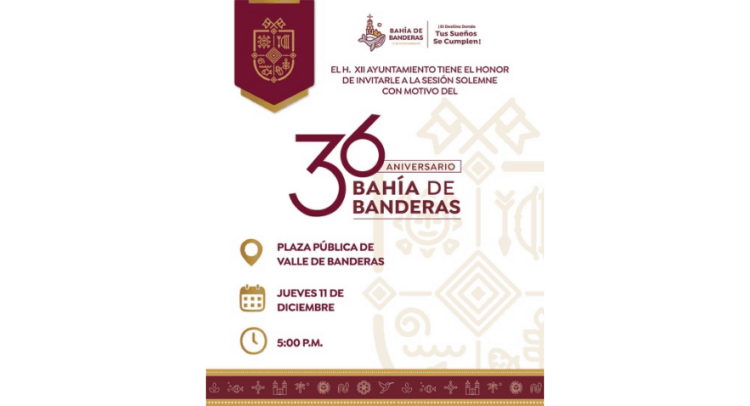 El Honorable XII Ayuntamiento de Bahía de Banderas, invita a toda la ciudadanía a celebrar la Sesión Solemne, esto en el marco del 36.º Aniversario del Municipio, un momento significativo para reconocer la identidad y desarrollo del municipio.