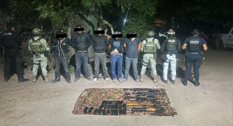 Personal del Ejército Mexicano y la Guardia Nacional, en coordinación con la Secretaria de Seguridad y Protección Ciudadana del Estado, aseguran a cinco personas, armamento y equipo táctico en el Municipio de Acaponeta, Nayarit.