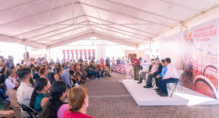 La presidenta del Sistema DIF Nayarit, doctora Beatriz Estrada Martínez, y su esposo, el gobernador del estado, Miguel Ángel Navarro Quintero, realizaron la entrega de triciclos de carga a 130 familias de 18 municipios de la entidad, una acción que fortalece el autoempleo y respalda el esfuerzo diario de quienes buscan generar ingresos propios y mejorar su calidad de vida.