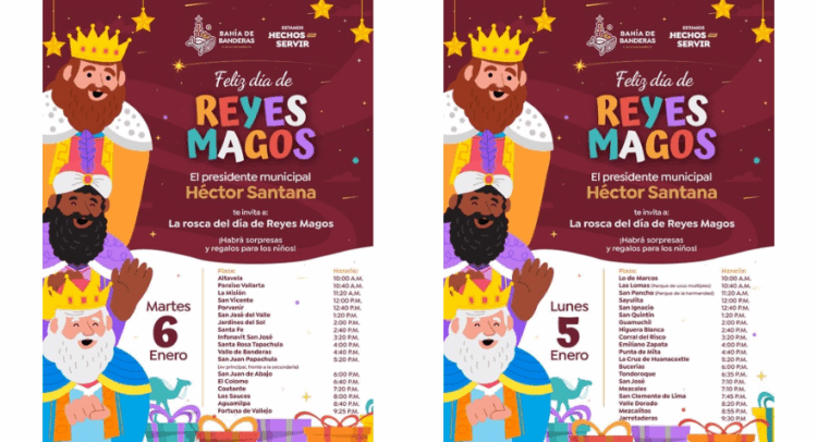 Con motivo del Día de Reyes, el H. XII Ayuntamiento de Bahía de Banderas, encabezado por el presidente municipal Héctor Santana, hace la invitación a todas las familias del municipio a participar en las partidas de rosca que se llevarán a cabo los próximos días 5 y 6 de enero en diferentes localidades.