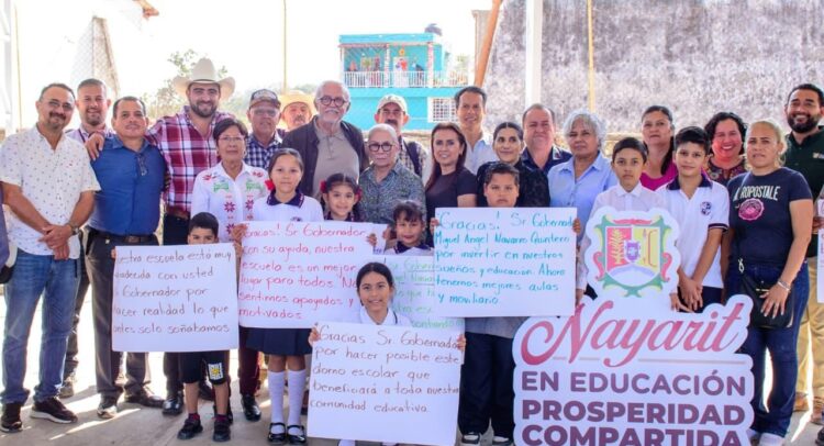 Con el propósito de mejorar las condiciones en las que estudian las niñas y niños en la entidad, el gobernador Miguel Ángel Navarro Quintero, acompañado de su esposa, la presidenta del Sistema DIF Nayarit, doctora Beatriz Estrada Martínez, entregó la techumbre de la cancha de usos múltiples en la Primaria Emiliano Zapata, ubicada en la localidad de El Borbollón, municipio de Compostela.