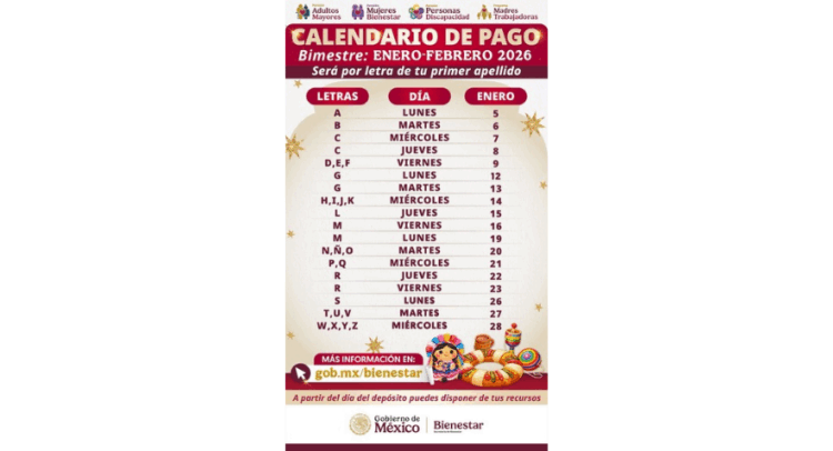 Ariadna Montiel agregó que, la fecha de pago, se puede consultar en la página oficial de la Secretaría de Bienestar: gob.mx/bienestar. Para brindar mejor atención, el depósito bancario se realiza de acuerdo con la letra del primer apellido de las beneficiarias, bajo el siguiente calendario: