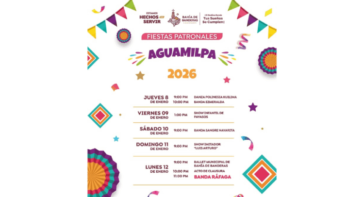 El H. XII Ayuntamiento de Bahía de Banderas, que encabeza el presidente municipal Héctor Santana, invita a la ciudadanía para asistir a las Fiestas Patronales Aguamilpa 2026, mismas que se celebrarán del 8 al 12 de enero con un programa de actividades culturales y artísticas.