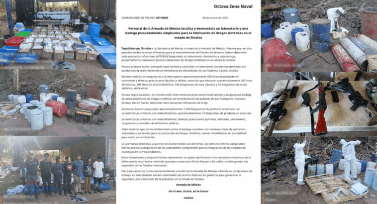 Personal de la Armada de México localizó y desmanteló un laboratorio clandestino y una bodega presuntamente utilizados para la fabricación y almacenamiento de drogas sintéticas en el estado de Sinaloa, como parte de acciones para el mantenimiento del Estado de derecho.