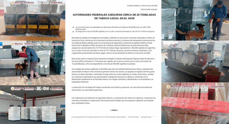 La acción fue encabezada por elementos de la Secretaría de Marina y la Aduana del AICM, en coordinación con la Secretaría de Seguridad y Protección Ciudadana, la Fiscalía General de la República, la Secretaría de la Defensa Nacional y la Guardia Nacional, quienes aseguraron más de 950 mil cajetillas de cigarrillos con un valor comercial estimado en más de 70.7 millones de pesos, provenientes de seis cargamentos originarios de Narita, Japón.