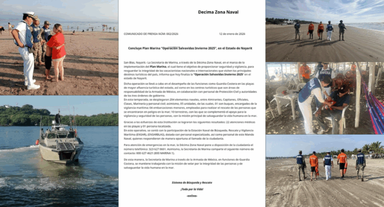 La Secretaría de Marina informó la conclusión del Plan Marina “Operación Salvavidas Invierno 2025” en el estado de Nayarit, operativo implementado para brindar seguridad y vigilancia a turistas nacionales e internacionales durante la temporada vacacional.