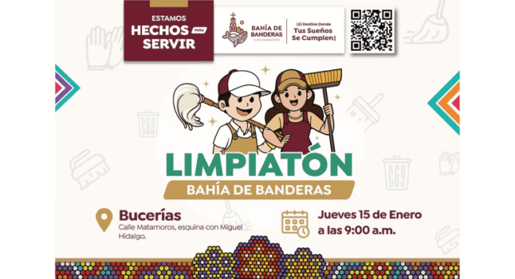 El H. XII Ayuntamiento de Bahía de Banderas llevará a cabo la primer jornada del año del Limpiatón este próximo jueves 15 de enero, a partir de las 9:00 a.m, teniendo como punto de encuentro la calle Matamoros, esquina con Miguel Hidalgo, lugar donde se desplegarán los equipos participantes para atender distintas zonas del poblado.