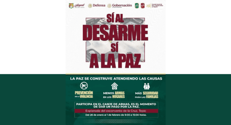 El Gobierno del Estado de Nayarit invita a participar en la campaña ¡Sí al Desarme, Sí a la Paz!, que se realizará del 26 de enero al 1 de febrero en la Explanada del Exconvento de la Cruz, en Tepic.