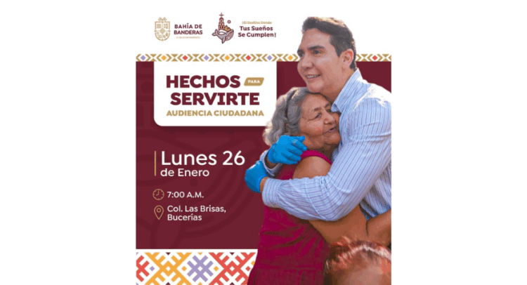El Gobierno Municipal de Bahía de Banderas invita a la ciudadanía a participar en la próxima Audiencia Ciudadana, que será encabezada por el presidente municipal Héctor Santana, misma que se llevará a cabo este próximo lunes 26 de enero, en punto de las 7:00 a.m, en la colonia Las Brisas, en el poblado de Bucerías.