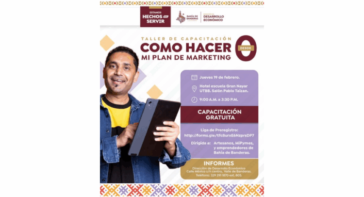 El H. XII Ayuntamiento de Bahía de Banderas, que encabeza el presidente municipal Héctor Santana, a través de la Dirección de Desarrollo Económico invita a emprendedores, artesanos, y MiPymes a participar este próximo 19 de febrero en el taller gratuito “Cómo Hacer Mi Plan de Marketing desde 0”.