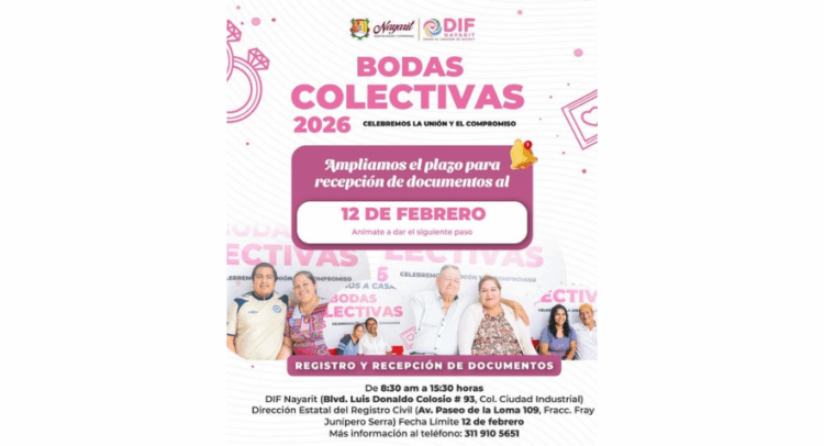 El Sistema DIF Nayarit informa que se amplió el plazo para el registro y recepción de documentos de las parejas que desean contraer matrimonio en las Bodas Colectivas 2026, el próximo 14 de febrero.