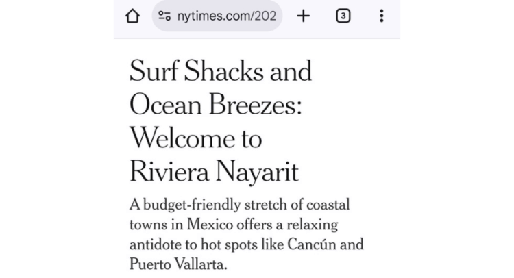 El gobernador del estado, Miguel Ángel Navarro Quintero informó que Nayarit continúa siendo reconocido a nivel internacional por su riqueza natural, cultural y turística. Hoy, The New York Times nombró al estado como el destino de México. En un reportaje publicado por el prestigioso medio, la escritora Colleen Creamer y el fotógrafo César Rodríguez recorrieron la Riviera Nayarit, destacando destinos como Sayulita, San Pancho, Lo de Marcos, Rincón de Guayabitos y La Peñita de Jaltemba, resaltando su autenticidad, belleza y hospitalidad.