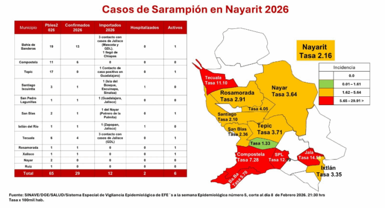 Con el objetivo de informar con transparencia, el Gobierno del Estado de Nayarit, a través de la Secretaría de Salud, comparte el panorama epidemiológico actualizado sobre los casos de sarampión en la entidad, como parte del monitoreo permanente que se realiza en todos los municipios.