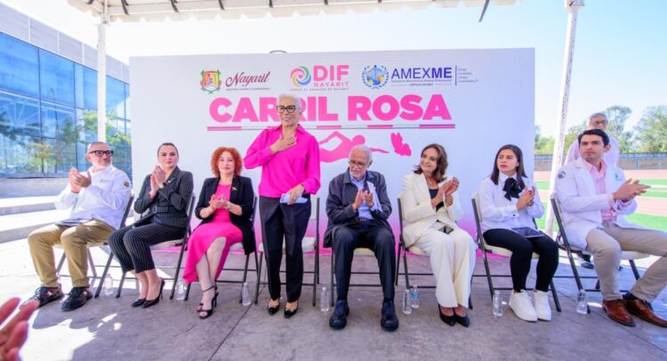 Junto a su esposa, la doctora Beatriz Estrada Martínez, presidenta del Sistema DIF Nayarit, el gobernador del estado, Miguel Ángel Navarro Quintero, dieron inicio al programa “Carril Rosa” en la Unidad Deportiva Nayarit, en Tepic, el cual está pensado para mujeres que han enfrentado el cáncer de mama y hoy viven con linfedema.