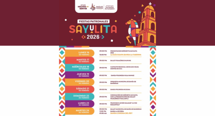 El Gobierno Municipal de Bahía de Banderas, que encabeza el presidente municipal Héctor Santana, te invita a celebrar las fiestas Patronales de Sayulita, una de sus celebraciones más representativas, mismas que se llevarán a cabo del 16 al 24 de febrero, consolidándose como un espacio de encuentro, tradición y convivencia para familias y visitantes.
