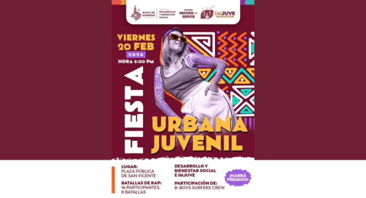 El Gobierno Municipal de Bahía de Banderas, encabezado por el presidente municipal Héctor Santana, te invita este próximo 20 de febrero de 2026, en punto de las 5:00 p.m., a la Plaza Pública de San Vicente, misma que será sede de la Fiesta Urbana Juvenil, un espacio para celebrar la cultura urbana y el talento local.