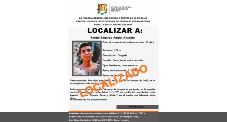 La Fiscalía General del Estado de Nayarit confirmó la identificación de uno de los cuatro jóvenes localizados sin vida en el municipio de Tecuala, se trata de Sergio Eduardo Aguiar Anzaldo, originario de Ixtlán del Río, quien contaba con ficha de búsqueda activa.
