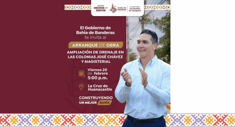 El Gobierno de Bahía de Banderas, encabezado por el presidente municipal Héctor Santana, invita a la ciudadanía al arranque de obra de la ampliación de drenaje en las colonias José Chávez y Magisterial en La Cruz de Huanacaxtle.
