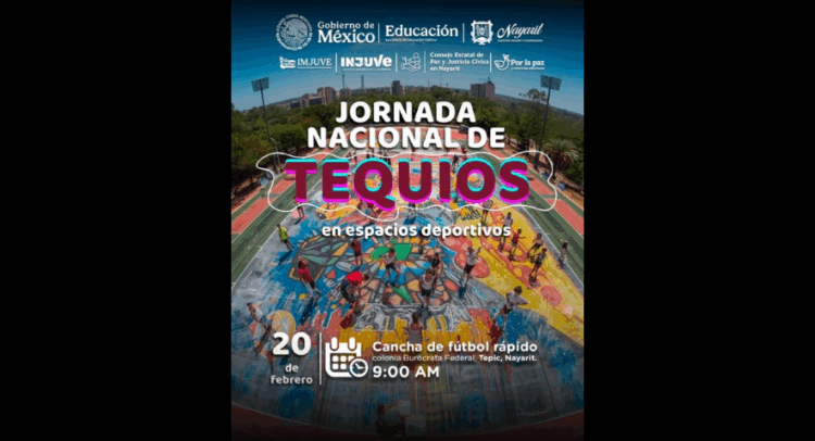 El Gobierno del Estado, a través del Instituto Nayarita de la Juventud, te invita a ser parte de la Jornada Nacional Tequios en espacios deportivos, una actividad colectiva por la paz y contra las adicciones para la reconstrucción del tejido social.