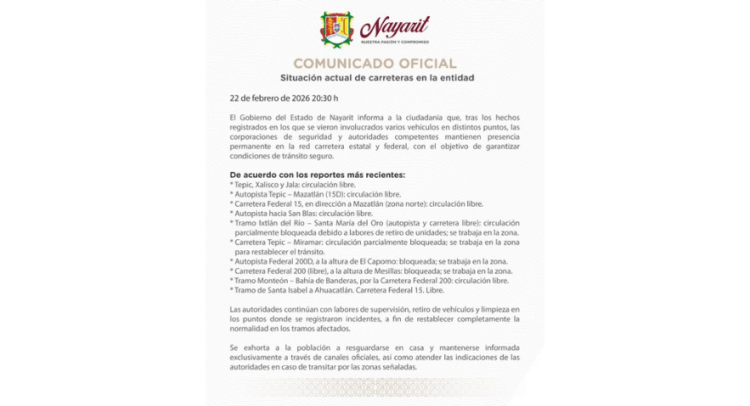 De acuerdo con el reporte más reciente, la mayoría de las vías presentan circulación libre; sin embargo, algunos tramos como Ixtlán del Río–Santa María del Oro y Tepic–Miramar registran bloqueos parciales, mientras que la autopista Federal 200D a la altura de El Capomo y la carretera libre en Mesillas permanecen bloqueadas. Autoridades continúan con labores de retiro de unidades y limpieza para restablecer la normalidad.