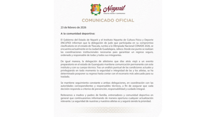 El Gobierno del Estado, en conjunto con el Instituto Nayarita de Cultura Física y Deporte, informó que la delegación de judo que participaba en un clasificatorio rumbo a la CONADE 2026 se encuentra actualmente en Guadalajara, desde donde se realizan las gestiones necesarias para garantizar un retorno seguro y ordenado de sus integrantes.