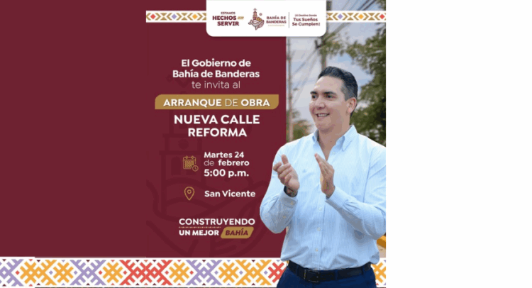 El Gobierno de Bahía de Banderas, que encabeza el presidente municipal Héctor Santana, invita a la ciudadanía al arranque de obra de la nueva calle Reforma, que se realizará este martes 24 de febrero en. punto de las 5:00 p.m., en el poblado de San Vicente.