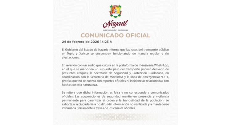 El Gobierno del Estado de Nayarit informó que las rutas del transporte público en Tepic y en zonas de Jalisco continúan funcionando de manera regular, sin afectaciones en el servicio. La autoridad señaló que, hasta el momento, no existen reportes oficiales ni incidencias relacionadas con hechos de inseguridad que impliquen la suspensión del transporte.