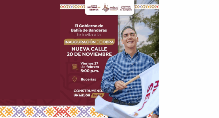 El Gobierno Municipal de Bahía de Banderas, que encabeza el presidente municipal Héctor Santana, invita a la gran inauguración de la nueva Calle 20 de Noviembre, en Bucerías.