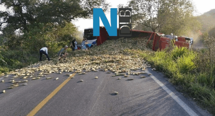Se trata de la volcadura de un camión torton con carga de elotes que obstruye ambos carriles.