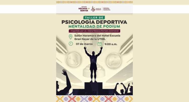 El Gobierno de Bahía de Banderas, encabezado por Héctor Santana, a través de la Dirección del Deporte Municipal, invita a deportistas del municipio a participar en el Taller de Psicología Deportiva “Mentalidad de Podio”, que se llevará a cabo el próximo 7 de marzo a las 9:00 de la mañana.