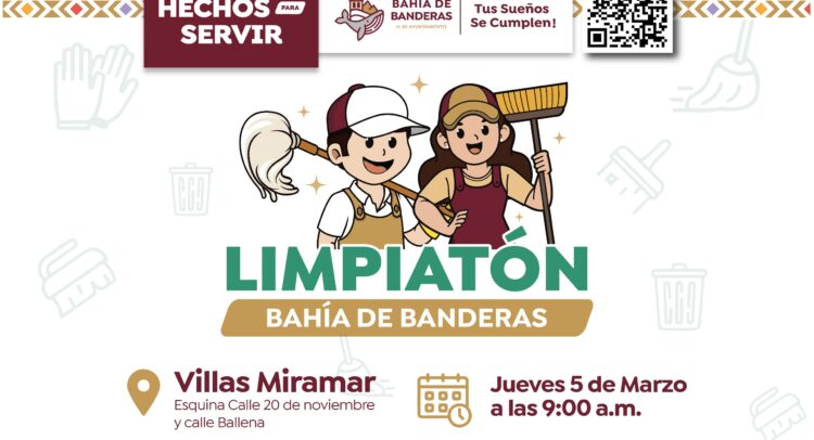 El H. XII Ayuntamiento de Bahía de Banderas anunció la realización de la jornada del Limpiatón en Villas Miramar, misma que se llevará a cabo el próximo jueves 5 de marzo a las 9:00 de la mañana y tendrá como punto de encuentro la esquina de las calles 20 de Noviembre y Ballena, donde autoridades municipales y ciudadanía sumarán esfuerzos para mejorar la imagen urbana y fortalecer el cuidado de los espacios públicos.