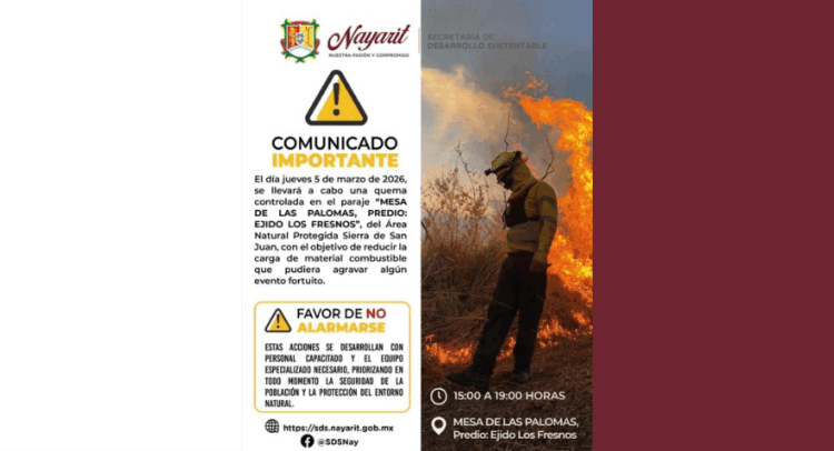 El Gobierno del Estado de Nayarit, a través de la Secretaría de Desarrollo Sustentable, informa que en estos momentos se realiza una quema prescrita controlada en el paraje Mesa de Las Palomas, en el ejido Los Fresnos, en Tepic.