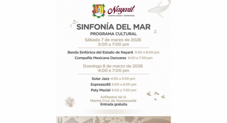 El Gobierno del Estado de Nayarit dio a conocer el programa cultural “Sinfonía del Mar”, que se realizará los días 7 y 8 de marzo de 2026 en el Anfiteatro de la Marina de La Cruz de Huanacaxtle.