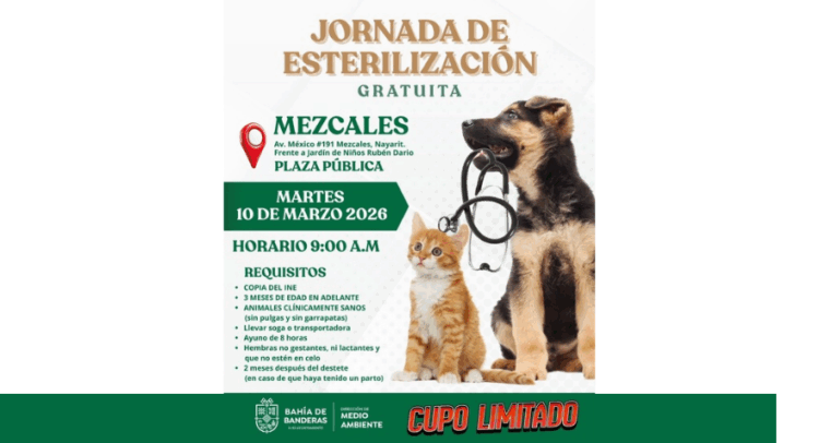 El H. XII Ayuntamiento de Bahía de Banderas, que encabeza el presidente municipal Héctor Santana, a través de la Dirección de Medio Ambiente, realizará una nueva jornada gratuita de esterilización para perros y gatos con el objetivo de fomentar el bienestar animal y el control responsable de mascotas.