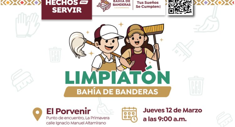 Con el objetivo de fortalecer la cultura del cuidado del entorno y mantener espacios públicos limpios, el gobierno municipal de Bahía de Banderas, que encabeza el presidente municipal Héctor Santana, invita a la ciudadanía a sumarse a la nueva jornada del Limpiatón, que se realizará el próximo jueves 12 de marzo a las 9:00 de la mañana en la localidad de El Porvenir.