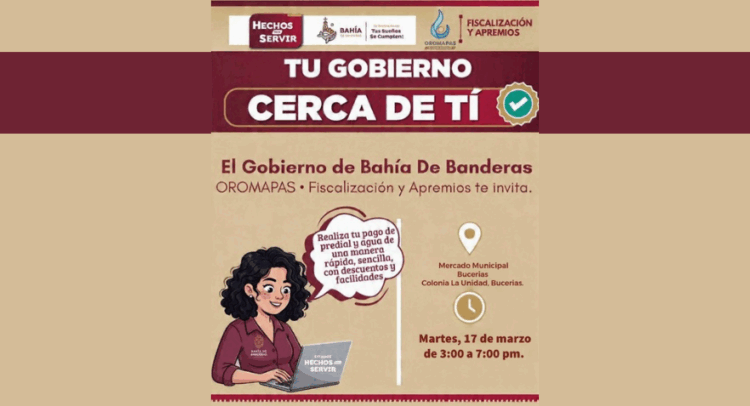 Con el objetivo de facilitar el cumplimiento de las contribuciones municipales, el Gobierno de Bahía de Banderas, a través de OROMAPAS y el área de Fiscalización y Apremios, llevará a cabo la jornada “Tu Gobierno Cerca de Ti”, donde la ciudadanía podrá realizar el pago de predial y agua de manera rápida y sencilla.