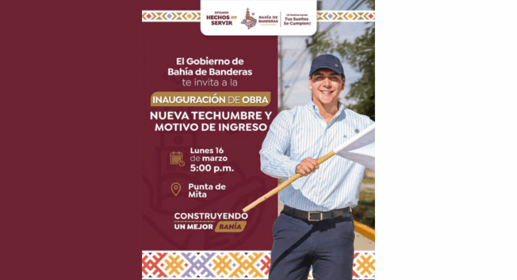 El Gobierno Municipal de Bahía de Banderas invita a la ciudadanía a participar en la inauguración de la obra de Nueva Techumbre y Motivo de Ingreso en la localidad de Punta de Mita, un proyecto que forma parte de las acciones de mejora de la infraestructura urbana impulsadas por la administración municipal.