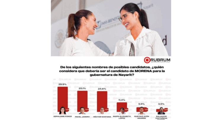 De acuerdo con la más reciente encuesta de Rubrum (marzo de 2026), Geraldine Ponce se posiciona como la figura más competitiva al interior de Morena, con 29.9% de preferencia, superando ampliamente a otros perfiles.