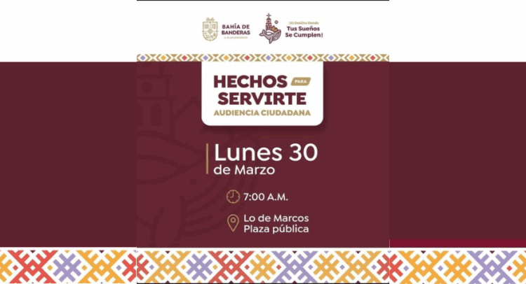El Gobierno Municipal de Bahía de Banderas invita a la población a participar en la próxima Audiencia Ciudadana, que se llevará a cabo el próximo lunes 30 de marzo a las 7:00 a.m en la plaza pública de Lo de Marcos.