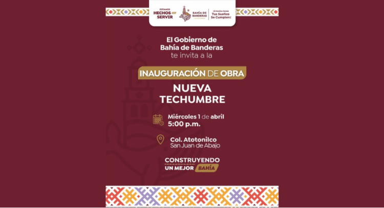 El Gobierno Municipal de Bahía de Banderas hace una atenta invitación a la ciudadanía para asistir a la inauguración de la nueva Techumbre, una obra que fortalecerá la infraestructura comunitaria y brindará mejores espacios para la convivencia social de esta colonia.