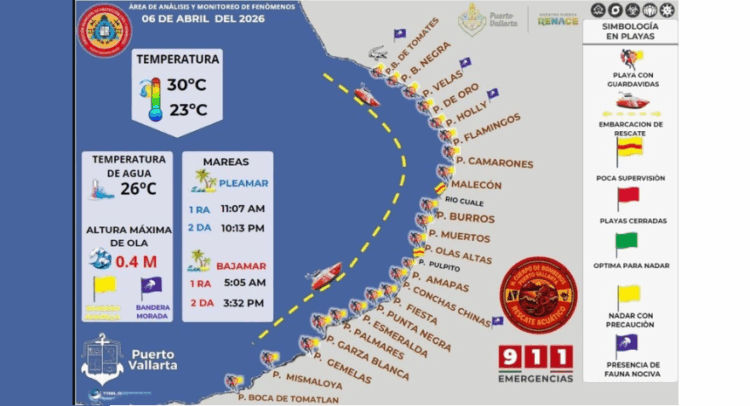 La Dirección de Protección Civil y Bomberos de Puerto Vallarta emitió un reporte sobre las condiciones del mar en las playas del municipio durante el periodo vacacional de Semana Santa y Pascua 2026. De acuerdo con el informe, la mayoría de los balnearios se encuentran bajo bandera amarilla, lo que implica precaución al ingresar al agua. Entre las playas en esta categoría figuran Los Muertos, Mismaloya, Olas Altas, Malecón, Camarones, Flamingos y Garza Blanca, entre otras.