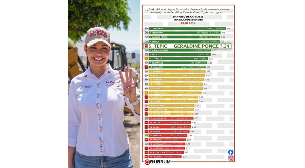 De acuerdo con la casa encuestadora Rubrum, la presidenta municipal de Tepic cuenta con una calificación de 7.24 sobre 10, además de ser la mejor evaluada de Morena en este ranking.