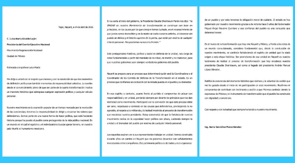 En una semana en la que circularon rumores dirigidos a debilitar el rol de la dirigencia nacional. Geraldine Ponce, aspirante principal de Morena en el estado, reconoció el liderazgo de Alcalde mediante una carta centrada en el papel del movimiento en Nayarit, en México y en el contexto internacional.
