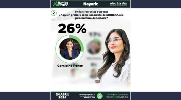 Tepic.— Una encuesta de Electoralia ubica a la presidenta municipal de Tepic, Geraldine Ponce, al frente de las preferencias en Morena con 26%, superando por 9 puntos a su competidor más cercano, lo que confirma su posicionamiento como la principal aspirante rumbo a la gubernatura de Nayarit en 2027.