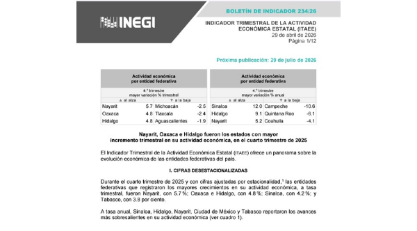 Nayarit cerró el cuarto trimestre de 2025 como una de las entidades con mayor actividad económica de México, al ubicarse en el primer lugar nacional en crecimiento trimestral y en el tercer lugar en crecimiento anual, de acuerdo con el Indicador Trimestral de la Actividad Económica Estatal (ITAEE) del INEGI. La entidad registró un incremento de 5.7 por ciento respecto al trimestre anterior y de 5.2 por ciento en comparación con el mismo periodo de 2024, posicionándose entre los estados con mejor desempeño económico del país.