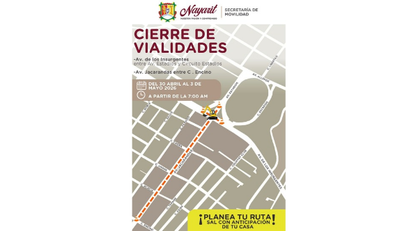 El Gobierno del Estado de Nayarit, a través de la Secretaría de Movilidad, informa que a partir del 30 de abril y hasta el 3 de mayo se implementará un cierre vial en la avenida Jacarandas e Insurgentes de Tepic, debido a los trabajos que se realizan en la zona, con el objetivo de garantizar la seguridad y el correcto desarrollo de la obra.